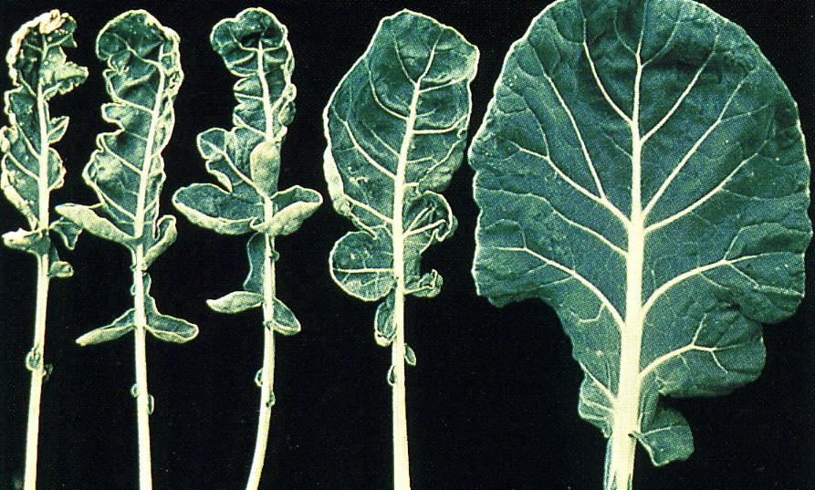 Copper deficiency leads to misshapen leaves, wilted plants, stunted growth as the stem length between the leaves shortens, the colour of flowers is often lighter than normal.